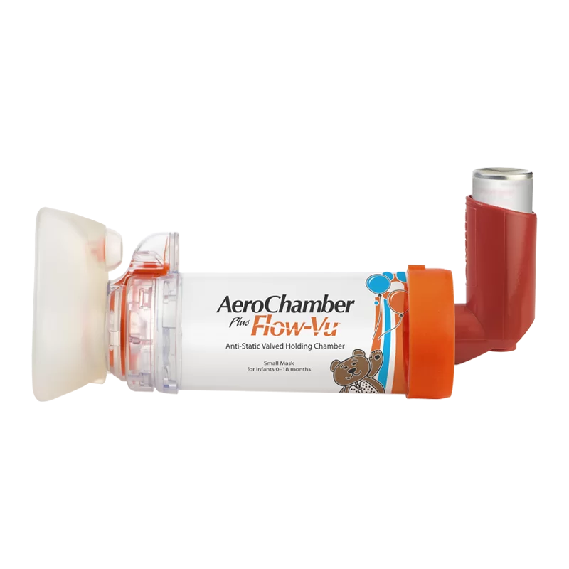 Using an AeroChamber Plus Flow-Vu Chamber with your inhaler helps ensure your medicine is delivered where it is needed. The chamber comes with a Flow-Vu dedicated inhalation indicator that moves as you breathe, providing assurance of correct use and medication delivery. It fits all commonly prescribed metered dose inhalers (and soft mist inhalers). The AeroChamber Plus Flow-Vu Chamber is the only chamber with a dedicated inhalation indicator. The Flow-Vu Inhalation Indicator gives caregivers visual assurance of correct use and medication delivery. Helps co-ordinate actuation with inhalation. Anatomically shaped facemask contours gently to the face. Extra sensitive, low-resistance valve designed specifically for children. -