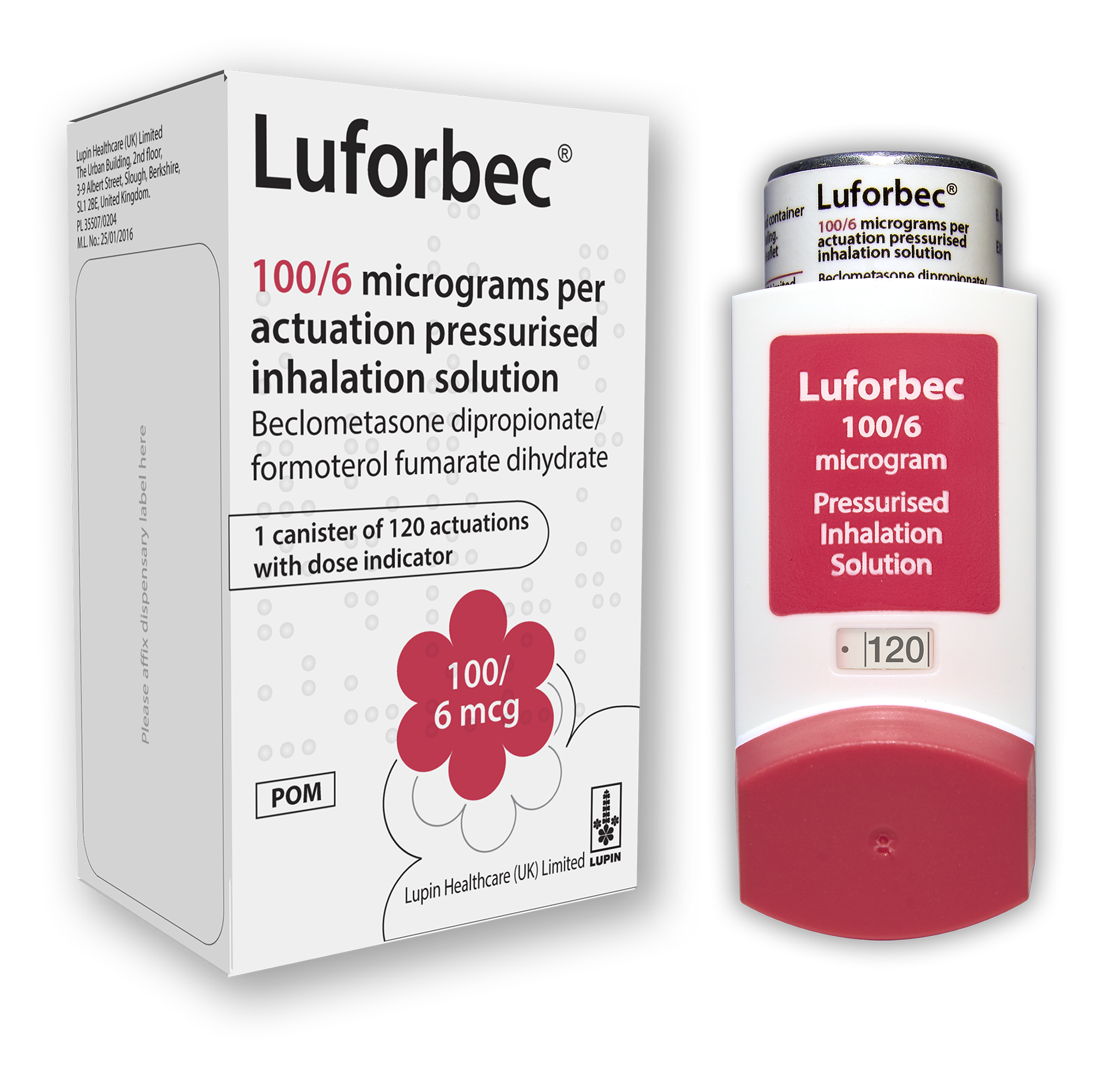 Luforbec is a pressurised inhalation solution containing two active substances which are inhaled through your mouth and delivered directly into your lungs. The two active substances are beclometasone dipropionate and formoterol fumarate dihydrate. Beclometasone dipropionate belongs to a group of medicines called corticosteroids which have an anti-inflammatory action reducing the swelling and irritation in your lungs. Formoterol fumarate dihydrate belongs to a group of medicines called long-acting bronchodilators which relax the muscles in your airways and helps you to breathe more easily. Together these two active substances make breathing easier, by providing relief from symptoms such as shortness of breath, wheezing and cough in patients with asthma or COPD and also help to prevent the symptoms of asthma. Lufrobec is indicated in the regular treatment of asthma in adult patients whom:- Asthma is not adequately controlled by using inhaled corticosteroids and “as needed” short-acting bronchodilators.