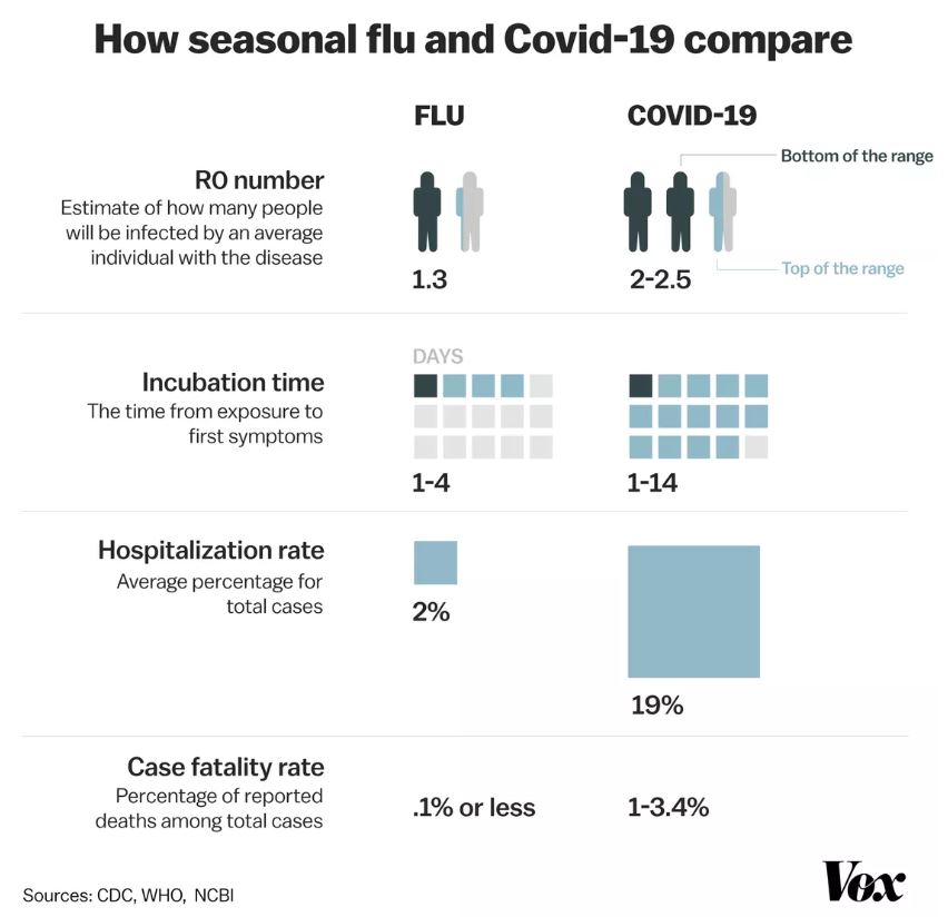 COVID-19 spreads to on average twice the amount of people per person carrying the virus as flu. A person with COVID-19 carries the virus for 1-14 days compared to 1-4 days for seasonal flu. 19% of those with COVID-19 will be hospitalised as opposed to the 2% of flu sufferers, which causes major burdens on the NHS. Finally, flu has a fatality rate of 0.1%, COVID-19 has a fatality rate of 1-3.4%. VOX have provided an infographic collating data from WHO, CDC & NCBI to help understand how the virus’ compare.