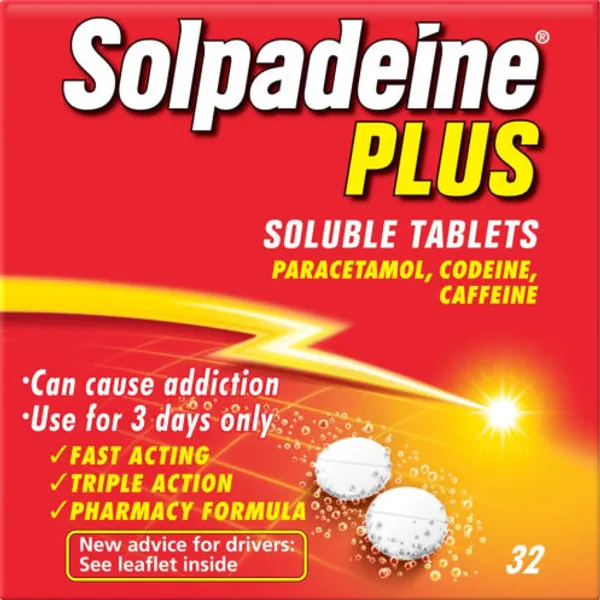 Solpadeine plus soluble tablets (similar to Solpadeine max) contains Paracetamol, Codeine Phosphate Hemihydrate and Caffeine for fast acting and effective pain relief. The over-the-counter treatment is triple action analgesic (or painkiller) that is used to treat acute moderate pain when other painkillers have not worked.